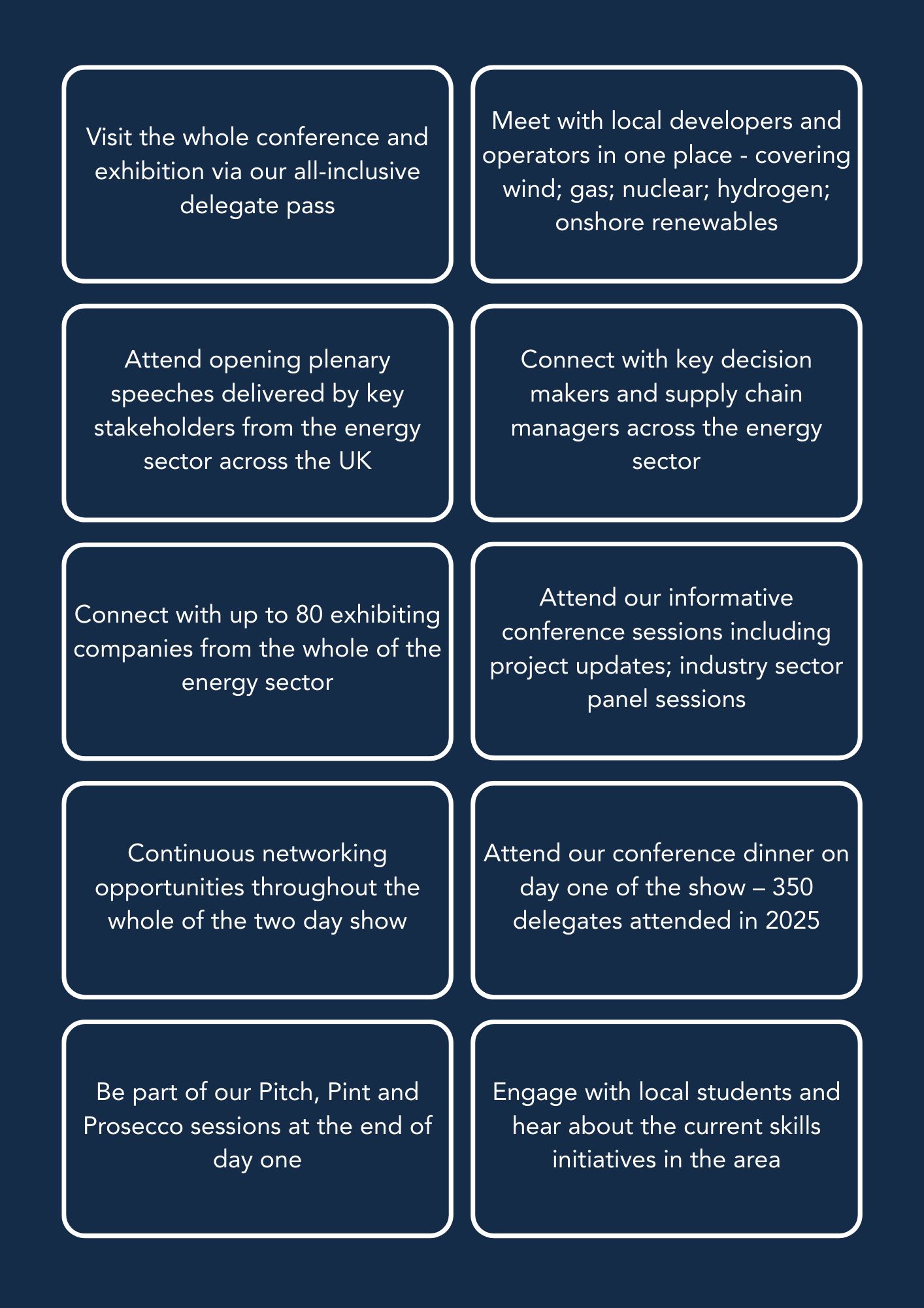 The event provides a unique opportunity to listen to key industry speakers, hear updates on the projects in the region, establish new partnerships, meet new contacts through one-to-one meetings with the supply chain, and provides enhanced networking opportunities via the show floor, within the conference arena or by attending our workshops.